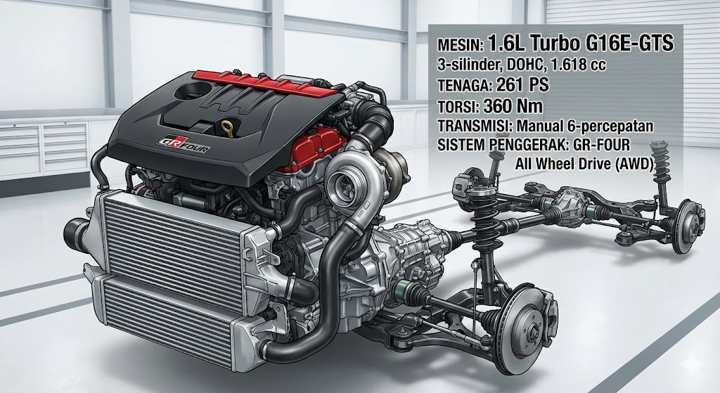 GR Yaris dibekali mesin yang menjadi sorotan dunia otomotif, yaitu mesin 1.6L 3-silinder turbo yang dikembangkan khusus oleh Toyota Gazoo Racing.