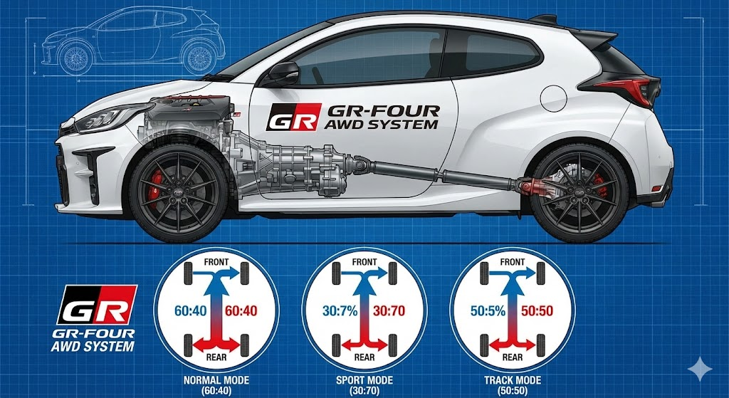 Salah satu keunggulan utama GR Yaris adalah sistem penggerak GR-FOUR AWD, yang memungkinkan distribusi tenaga depan dan belakang disesuaikan dengan kondisi berkendara.
