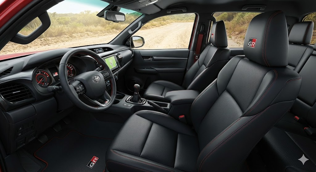 Kabin yang luas dengan posisi duduk tinggi memberikan kenyamanan serta visibilitas yang baik. Tata letak dashboard dan kontrol yang ergonomis membuat Hilux GR Sport nyaman digunakan untuk perjalanan jauh maupun aktivitas sehari-hari.