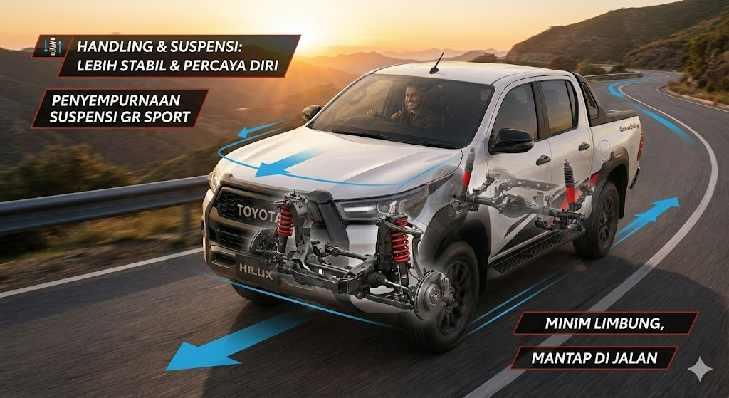 Sebagai bagian dari lini GR Sport, Toyota memberikan penyempurnaan pada sektor suspensi dan pengendalian. Setelan ini membuat Hilux GR Sport terasa lebih stabil, minim limbung, dan lebih nyaman dikendarai, terutama saat melaju dengan kecepatan konstan atau membawa beban.